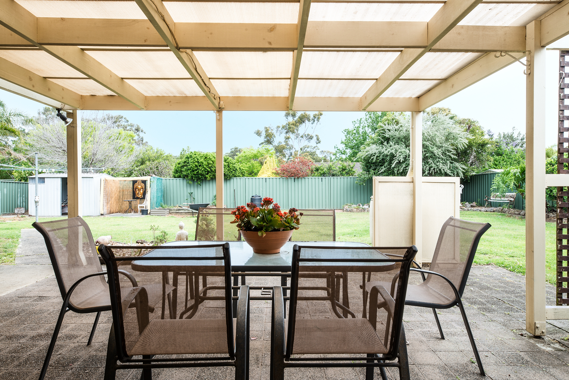 The North-facing front yard, south facing entertaining area perfect for hosting family BBQs and soaking in the summer rays while kids and pets frolic around the substantial lawned area amid well-maintained gardens.