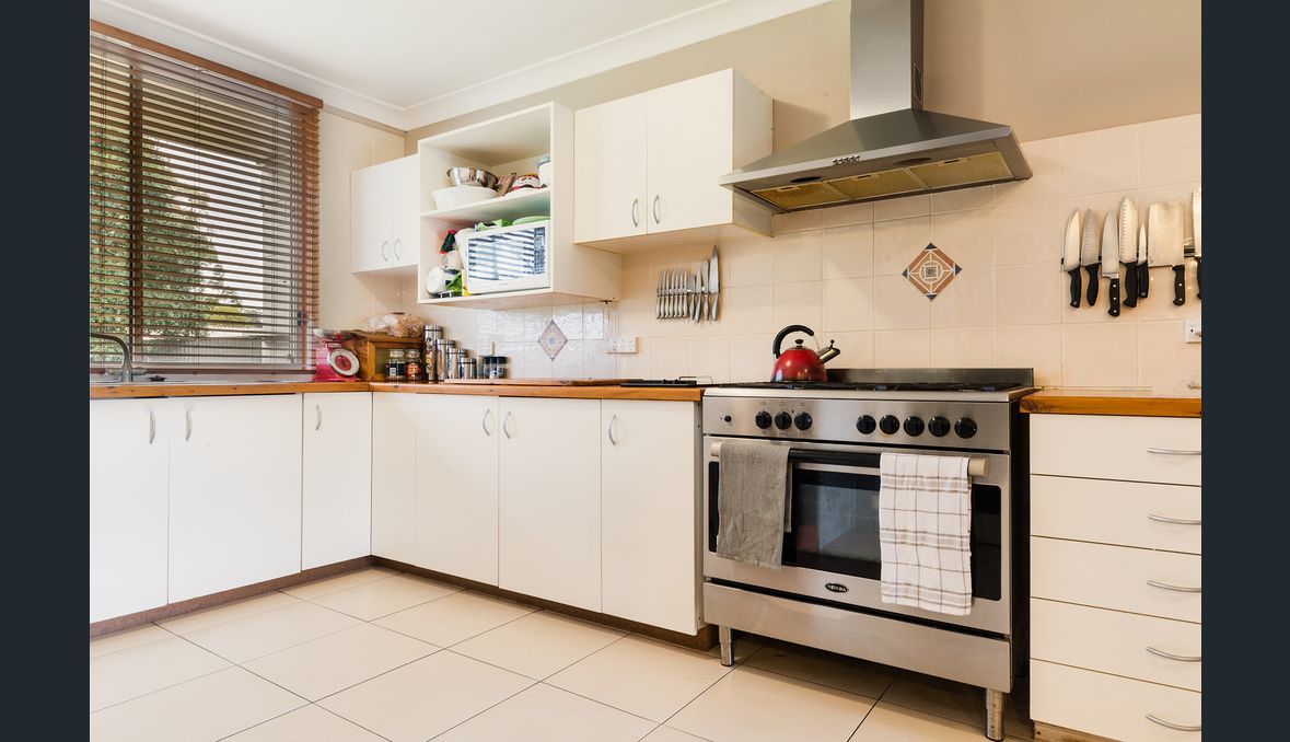 The kitchen features recently new cabinetry with large gas cook-top, additional single cook top, under bench oven, walk in pantry, oversized refrigerator space, double sink and dishwasher.