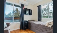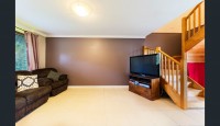 Downstairs the home comprises the first large living area with floor tiles and large split system adjacent to the designated dining area.