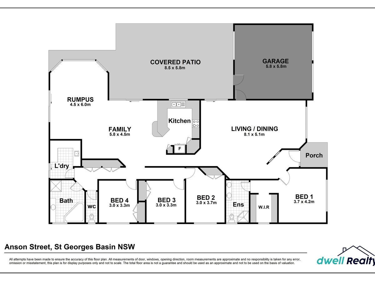 The property features a double garage with single drive-through access to a covered outdoor entertaining area, ideal for gatherings year-round.